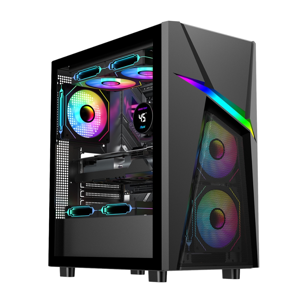 PC Casing with unique RGB front design, tempered glass side panel, and support for 360mm radiators
